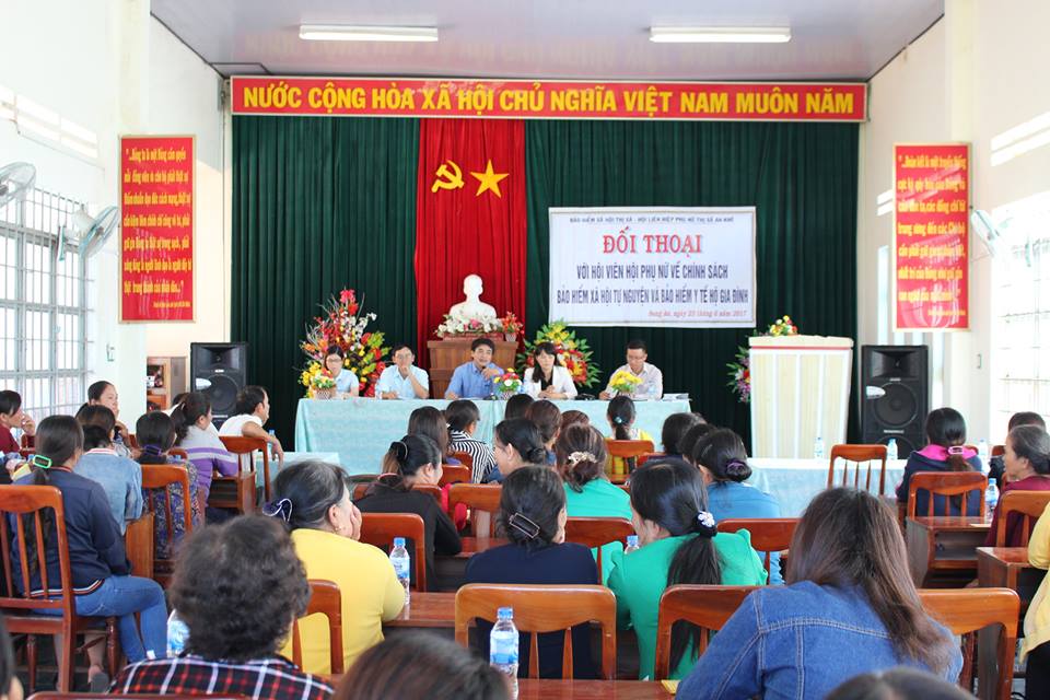 Sáng ngày 23/6/2017, cơ quan Bảo hiểm xã hội (BHXH) thị xã An Khê phối hợp với Hội Liên hiệp Phụ nữ (LHPN) thị xã An Khê tổ chức đối thoại với Hội viên phụ nữ xã Song An về chính sách BHXH tự nguyện và BHYT hộ gia đình