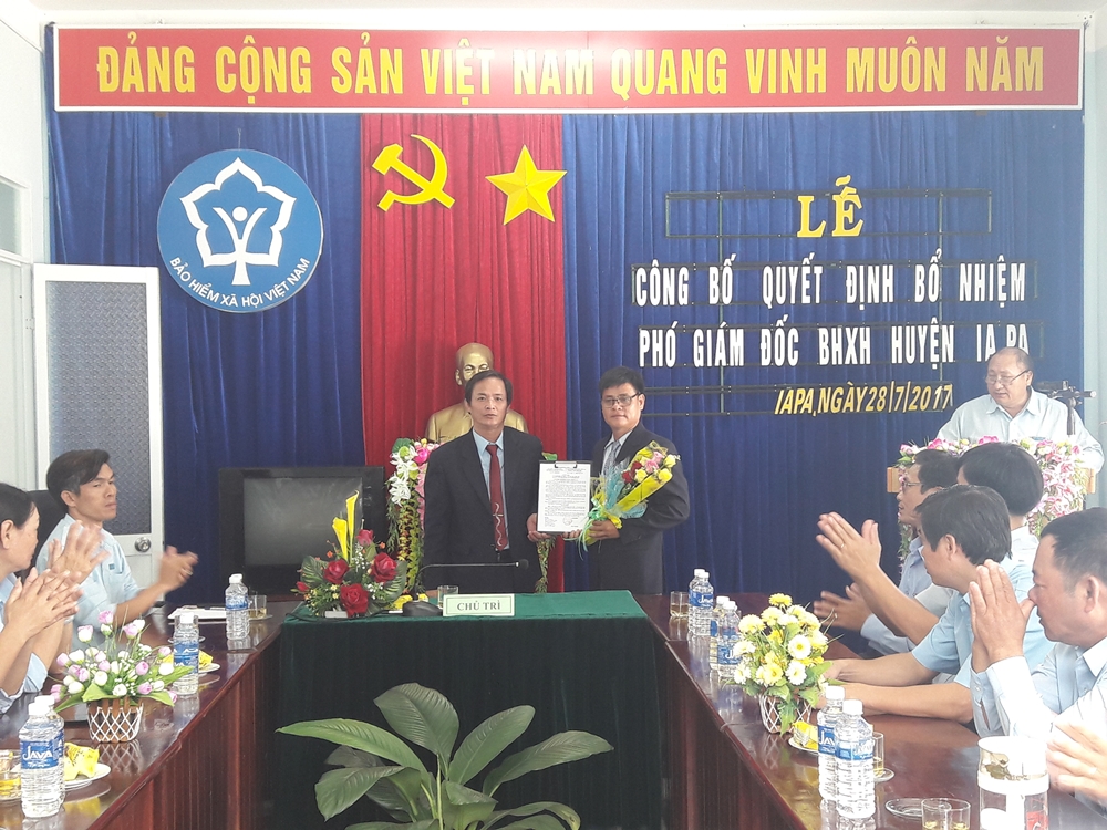 Thực hiện Nghị quyết của Đảng ủy cơ sở BHXH tỉnh về công tác cán bộ, sáng ngày 28/07/2017, BHXH tỉnh Gia Lai đã tổ chức lễ công bố và trao Quyết định bổ nhiệm viên chức quản lý BHXH huyện Ia Pa