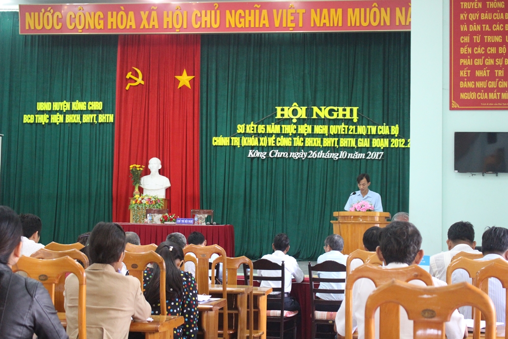 Ngày 26/10/2017, Ban Chỉ đạo thực hiện BHXH, BHYT, BHTN huyện Kông Chro tổ chức sơ kết 5 năm thực hiện Nghị quyết số 21-NQ/TW ngày 22/11/2012 của Bộ Chính trị về tăng cường sự lãnh đạo của Đảng đối với công tác BHXH, BHYT giai đoạn 2012-2020.